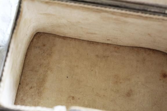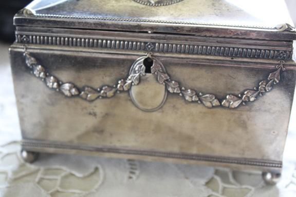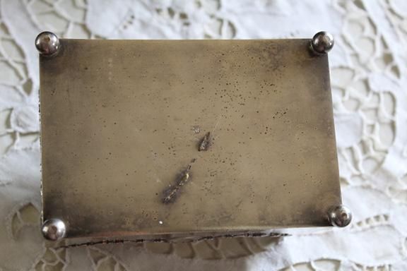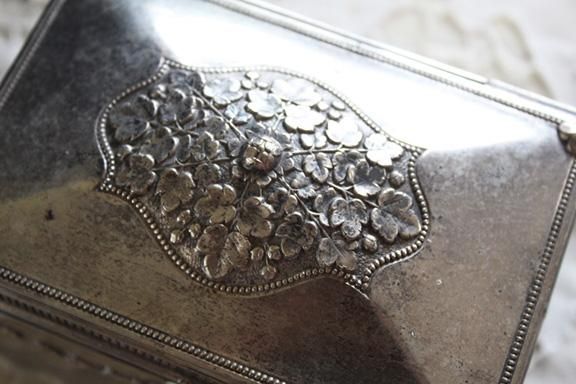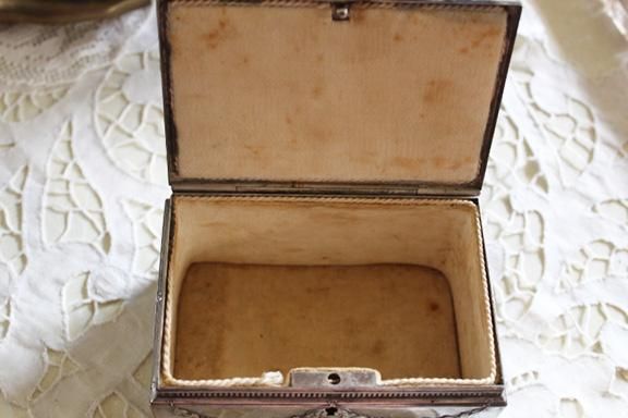 アンティーク シルバープレート製のジュエリーボックス 蓋にリーフのエンボス、側面にリーフのガーランドが美しいお品です。 内側は白のビロードが貼られています。 鍵はありません。 サイズ : W130mm×D85mm×H95mm 配送方法: ゆうパック<60>
