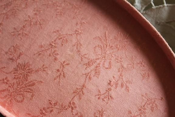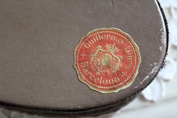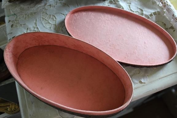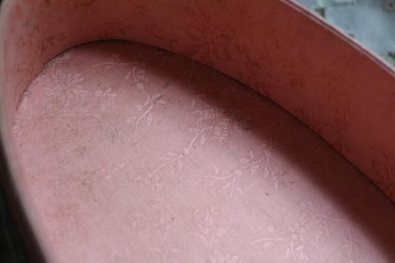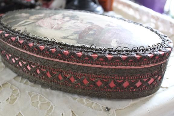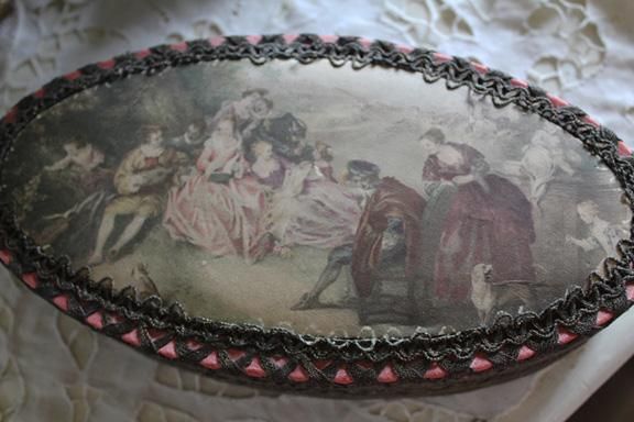 アンティーク カルトナージュボックス 蓋には森の中で貴婦人・貴公子・子供・犬が 楽しそうに会話している様子の紙が貼られ 側面のはピンクにゴールドのリボンが貼られていた美しいボックスです。 裏にスペインの紋章が入ったシールが貼られています。 サイズ : 直径265mm×H115mm 配送方法: ゆうパック<80>
