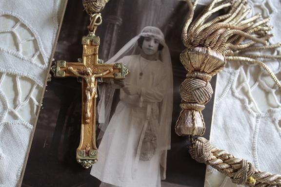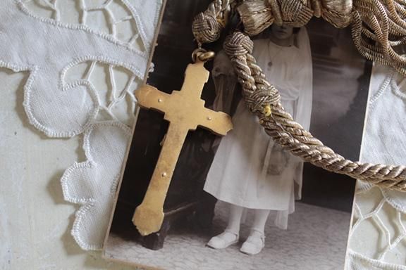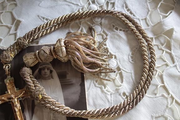ゴールドで編まれた太い紐がつき先端はフリンジになっています。