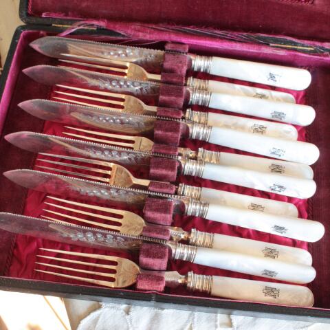 ハンドルはマザーオブパール、ナイフ、フォークにリーフの彫金がされています。