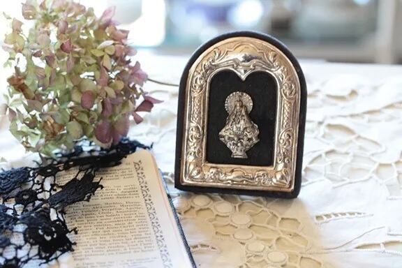 シルバーカラーのメタルの装飾に、メタルの聖母像が