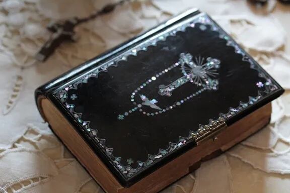 表紙にシェルの十字架、ロザリオ、鳩の象嵌が