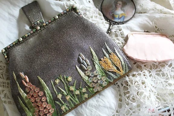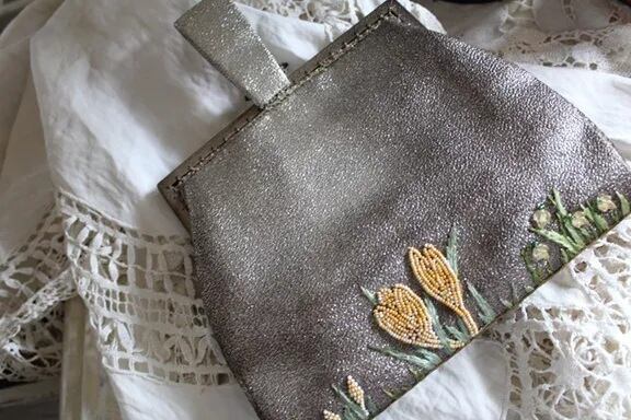 帯のような堅い生地にお花、スズランがビーズ刺繍でデザインされています。
