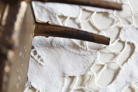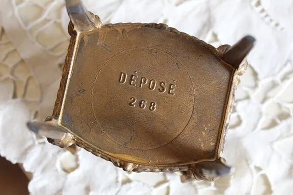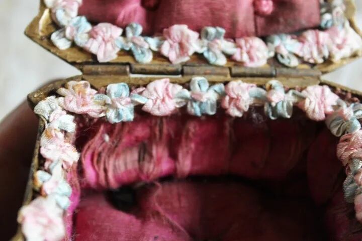 ロカイユ模様のゴールドメタルで内側は赤い布張り、
