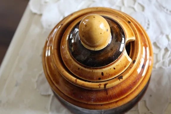 マスタード地に飴色のドットのような模様が入った可愛いデザインです。