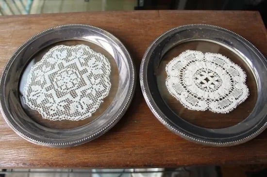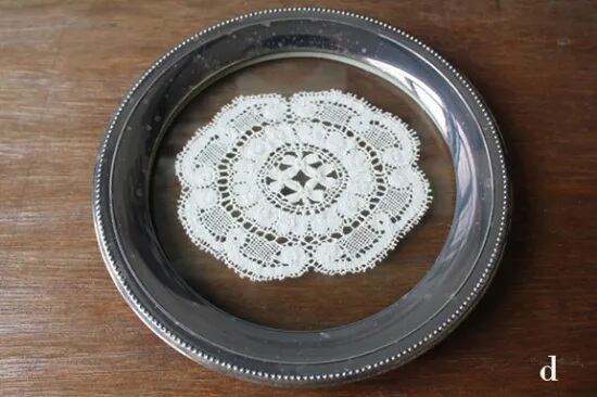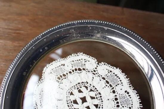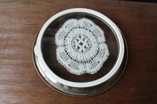 フチがシルバープレートで、ガラスにレースが挟まれています。