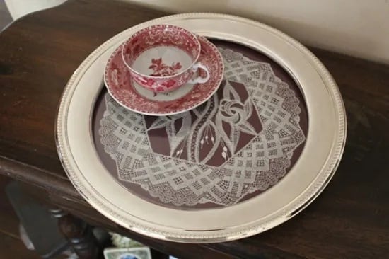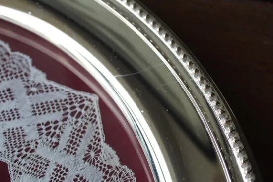 フチがシルバープレートで、ガラスにレースが挟まれています。