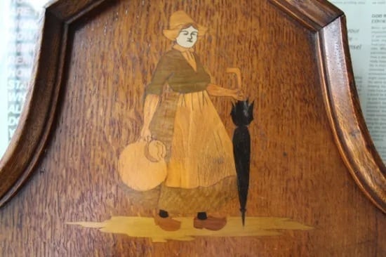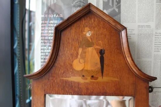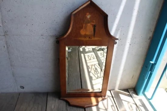 傘と水差しをもった女性の象嵌が入った壁掛けアンティークミラー