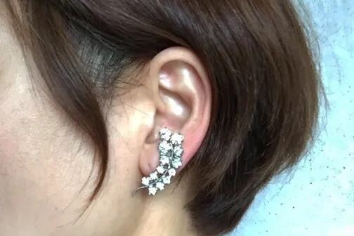 大きさの違うラインストーンが並び、リーフ型になったオシャレで気品のあるアンティーク イヤリングです。