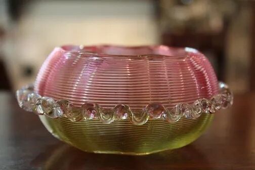クリアガラスボウルに上部はピンク、下部は黄緑のスレッド(糸)ガラスが巻かれ、クリアのフリルがつています。とてもかわいらしいデザインです。